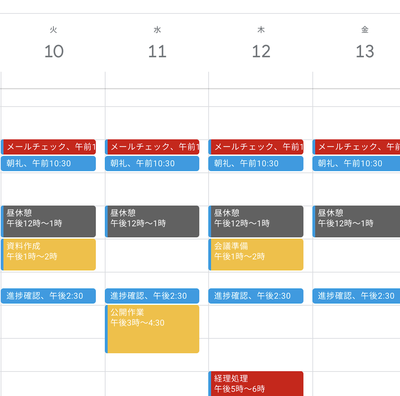 次にスケジュールの可視化です。こちらも最初にオススメするのはGoogleカレンダーです。Googleでなくてももちろん良いですが、日々のスケジュールを視覚的にわかりやすくするために、スケジュールを色付けで管理できるカレンダーだとより良いと思います。